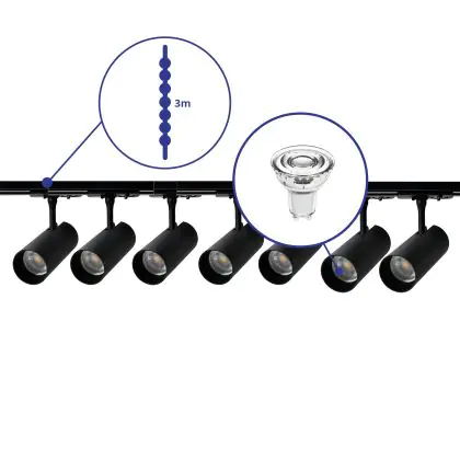 Complete Set 1-Phase Rail 3 Meter Black | incl. 7x Spot + GU10 2700K 3W Dimmable + End Cap, Power Connector and I-Connector