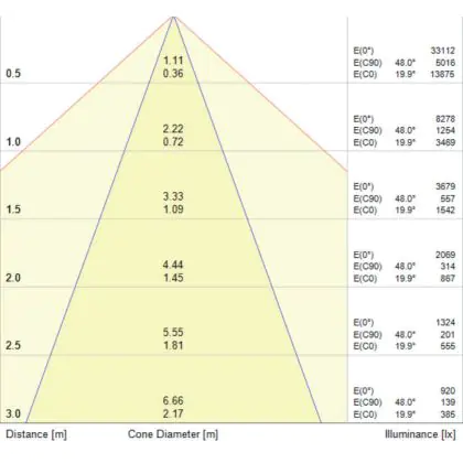 A beam angle indicates the angle of the light beam coming from a light source. The smaller the radiation angle in degrees (D), the narrower the beam angle.                                             | Beam Angle (degree) | 30 |