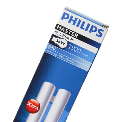 Philips PL-L Xtra 36W 840 4P will provide a cold white light, corresponding to a colour temperature of 4000K. Philips PL-L Xtra 36W 840 4P are very energy efficient, their energy label is classified B. These lamps offer the advantage of having a very long lifespan, 36000 hours on average.