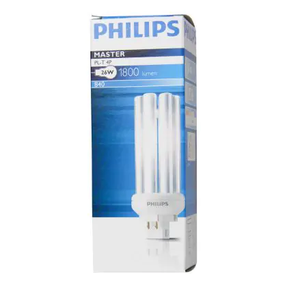 Philips PL-T 4P are energy efficient fluorescent lamps with separate power supply. These lamps must be used with a ferromagnetic ballast and have 4 pin sockets. Philips PL-T 26W 830 4P have a GX24q-3 socket type and measure 1200 cm.